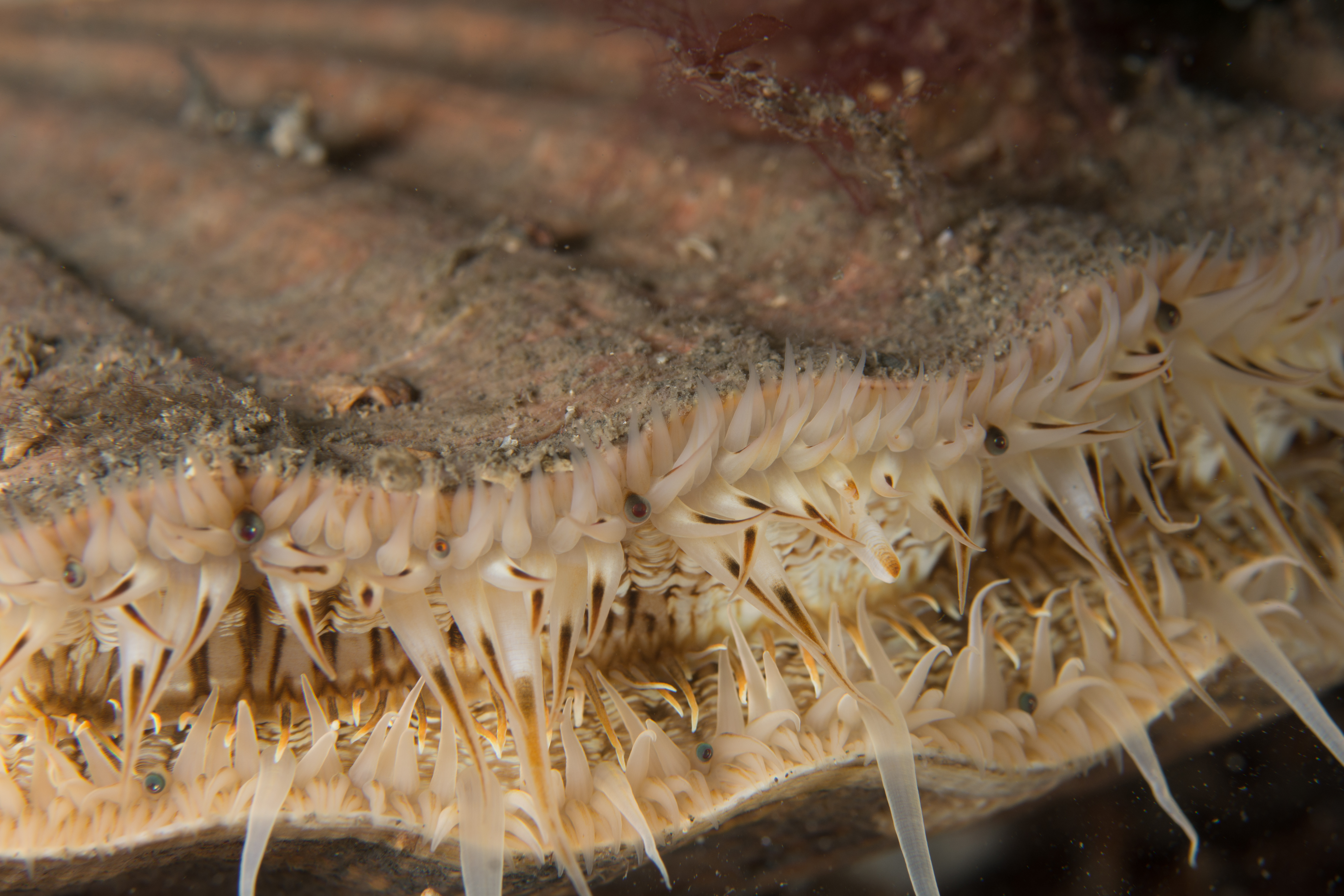 The scallop is always a species that has amazed me with the mess of eyes and sensory tentacles pocking out. With my macro lens I could really explore close up to these features.