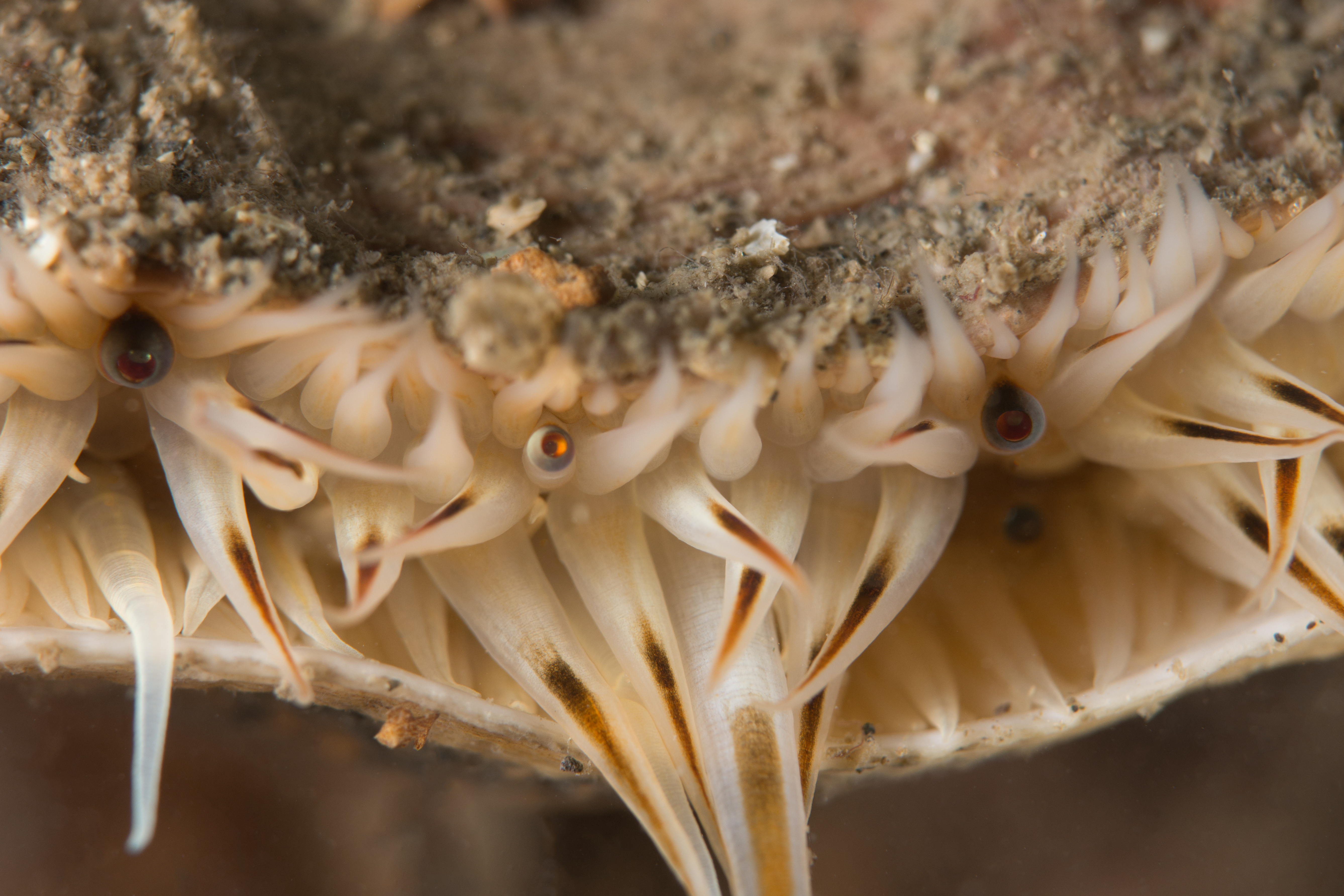 The scallop is always a species that has amazed me with the mess of eyes and sensory tentacles pocking out. With my macro lens I could really explore close up to these features.